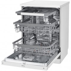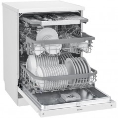 ماشین ظرفشویی ال جی 425 یا DFB425FW رنگ سفید یکی از محصولات تولید شده توسط ال جی در سال 2018 می باشد. شما ممکن است در سایر فروشگاه ها این محصول را به عنوان ماشین ظرفشویی ال جی DFB425 یا ماشین ظرفشویی B425 نیز مشاهده کنید که مدل کامل و درست آن نیست. این محصول به صورت روکار می تواند در آشپزخانه شما نصب شود. همچنین می تواند گزینه ای مناسب برای استفاده در خانواده های پر جمعیت به شمار آید، زیرا گنجایش ظرف های 14 نفر را دارد و می توانید به راحتی هر نوع ظرفی را به کمک آن تمیز نمایید. در ساخت ماشین ظرفشویی 14 نفره ال جی DFB425FW از موتور دایرکت درایو اینورتر استفاده شده که از بهترین موتور های تولید شده توسط این برند می باشد. موتور به کار رفته در این محصول موجب می شود که صدای کمی در هنگام کار کردن از خود تولید کند و بهترین عملکرد را از خود به نمایش بگذارد. ال جی این محصول را با ضمانت 10 ساله به شما عرضه می کند و می توانید با خیال راحت از آن برای شستشوی ظروف خود بهره ببرید. ال جی این ماشین ظرفشویی را با 10 برنامه شستشو تولید کرده و به کمک آن ها می توانید انواع ظروف کثیف خود را به طور کامل تمیز نمایید. همچنین قابلیت های اضافه ای دارد که باعث می شود شستشو و خشک کردن ظروف بهتر انجام گردد و در ادامه به معرفی آن ها می پردازیم. محصول یاد شده در داخل محفظه خود دارای 3 طبقه یا سبد بوده تا بتوانید انواع ظروف خود را در آن قرار دهید. طبقه بالای این محصول مناسب قرار دادن قاشق و چنگال بوده و می توانید آن ها را بدون ایجاد به هم ریختگی و آسیب رساندن به سایر ظروف به خوبی بشویید. ماشین ظرفشویی سه سبد ال جی DFB425FW یک طبقه در وسط برای قرار دادن ظروف متوسط و کوچک و یک طبقه در پایین برای قرار دادن ظرف های بزرگ تر مانند قابلمه و سینی دارد. همچنین دارای 3 اسپری آبپاش در بالا، وسط و پایین بوده و به کمک تکنولوژی QuadWash می تواند آب را از طریق 4 پره روی بازوی خود به سمت ظروف اسپری کند. همچنین مجهز به سیستم Vario Plus بوده تا شستشو و آبکشی بهتر انجام شود. ماشین ظرفشویی سه سبد ال جی 425 دارای سنسور تشخیص میزان کثیفی ظروف و آب بوده و به شما این امکان را می دهد که با استفاده از برنامه Auto هر نوع ظرفی را متناسب با میزان کثیفی اش بشویید. اگر می خواهید زمان کمی را به شستشوی ظروف خود اختصاص دهید، می توانید از برنامه Express استفاده کنید. برنامه Turbo نیز برای شستشوی سریع ظرف ها به کار می رود با این تفاوت که در پایان شستشو ظرف ها را خشک نیز می کند. البته باید در نظر داشته باشید که به دلیل سرعت بالای این نوع شستشو، مصرف آب و انرژی بیشتری نیز نسبت به سایر برنامه ها دارد. از طرفی، این ماشین ظرفشویی دارای برنامه Eco نیز بوده و می توانید شستشو و خشک کردن ظرف های خود را با صرفه جویی در مصرف آب و انرژی انجام دهید. این محصول مجهز به برنامه Intensive نیز بوده تا بتوانید ظرف هایی که خیلی چرب و کثیف هستند را با آب داغ به طور کامل تمیز نمایید. این ماشین ظرفشویی در ساخت خود از برنامه Delicate استفاده کرده و ظروف شیشه ای و حساس شما را بدون آسیب می شوید و خشک می نماید. اگر ظرف های شما برای مدت طولانی در کمد باقی قرار گرفته اند و روی آن ها خاک نشسته است، می توانید با برنامه Refresh آن ها را آبکشی نمایید. همچنین می توانید ظرف های کثیفی که می خواهید در زمان دیگری بشویید را با استفاده از برنامه Rinse به صورت سریع آبکشی کنید و از چسبیدن ذرات غذا به ظرف ها جلوگیری کنید. محصول یاد شده دارای برنامه Machine Clean بوده و به کمک آن می تواند داخل محفظه خود را به صورت خودکار تمیز نماید. علاوه بر برنامه های ذکر شده، اگر می خواهید به برنامه های دیگری دسترسی داشته باشید می توانید از برنامه Download Cycle استفاده کنید. ماشین ظرفشویی سه طبقه ال جی B425 برای عملکرد هر چه بهتر خود از چندین قابلیت بیشتر نیز استفاده می کند که می توانید در ادامه به مطالعه در مورد آن ها بپردازید. یکی از این قابلیت ها Dual Zone نام دارد که می توانید با استفاده از آن، ظروف بسیار کثیف و ظروف روزمر