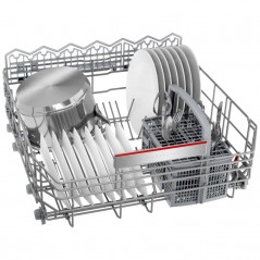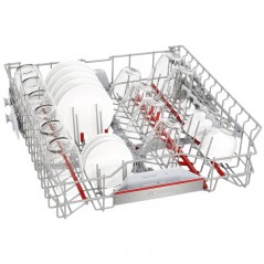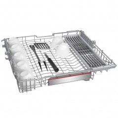 ماشین ظرفشویی 13 نفره بوش SMS8ZDW48Q با سبک طراحی مینیمال و نمایی کاملا ساده و در عین حال لوکس و مدرن طراحی شده است. این ماشین ظرفشویی با ابعاد 600x845x600 میلی متر عرضه شده است و امکان قرار دادن راحت و آسان آن در فضای داخل کابینت وجود دارد. همچنین ساختاری کاملا باکیفیت داشته و از متریال استیل ضد زنگ در آن استفاده شده است تا بتواند بالاترین سطح دوام و کیفیت را برایتان به ارمغان آورد. ضمن اینکه بدنه ی این دستگاه با قابلیت Anti-Fingerprint نیز مجهز شده و به دلیل توانایی آن در مقاومت در برابر اثر انگشت بدنه ی دستگاه همیشه تمیز و بدون لکه باقی می ماند. چیزی که این محصول را از دیگر ماشین ظرفشویی ها متمایز کرده است مجهز شدن آن به کنترل پنل مخفی می باشد که در واقع این بخش به قسمت داخلی و بر روی درب دستگاه انتقال یافته است. یعنی اینکه فقط با باز کردن درب ظرفشویی می توانید به برنامه های شستشو و تابع ها و گزینه های اضافی دسترسی داشته باشید. البته بر روی قسمت خارجی درب دستگاه نیز یک نمایشگر مستطیل شکل در پس زمینه ی مشکی رنگ تعبیه شده است که وظیفه ی نمایش اطلاعاتی مانند برنامه ی شستشو و زمان باقی مانده ی شستشو و ... را بر عهده دارد. درب این ماشین ظرفشویی را می توانید از سمت بالا رو به پایین باز کنید. محفظه ی داخلی ماشین ظرفشویی نیز از جنس استیل ضد زنگ ساخته شده است و بوش کیفیت آن را تا 10 سال تضمین کرده است. با باز کردن درب ماشین ظرفشویی سبد ها یا قفسه های ماشین ظرفشویی به چشم می خورند که با حداکثر انعطاف و گزینه های تنظیم بیشتر در اختیار شما قرار می گیرند. از طبقه ی بالایی می توانید برای قرار دادن کارد، قاشق و چنگال و همچنین کاسه های کوچک استفاده کنید. از سبد یا طبقه ی وسط این ماشین ظرفشویی می توانید برای قرار دادن ظروف متوسط استفاده کنید. از طبقه ی پایینی یا سبد سوم هم می توانید برای قرار دادن ظروف بزرگ استفاده کنید. شما می توانید با تنظیم پایه های داخلی طبقه پایین ماشین ظرفشویی مذکور، ظروف بزرگ مانند دیگ را نیز در درون آن جای دهید. باید گفت که این ماشین ظرفشویی علاوه بر طبقه مخصوص قاشق و چنگال یک سبد کوچک مجزا نیز دارد که از آن می توانید برای قرار دادن کارد و قاشق و چنگال های بیشتر استفاده نمایید. در صورت عدم استفاده از این سبد می توانید آن را از درون ماشین ظرفشویی خارج کنید و فضای بیشتری را در طبقه ی پایینی دستگاه در اختیار داشته باشید.